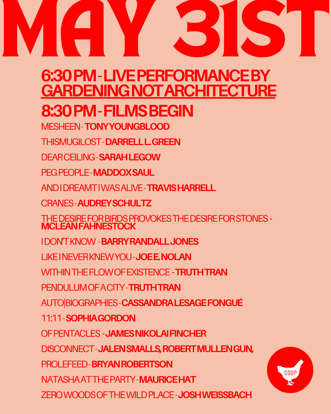 COOP is pleased to announce our sixth annual experimental film and video festival. This year the screening will take place outdoors at COOP Gallery in Nashville, TN on May 30–31.