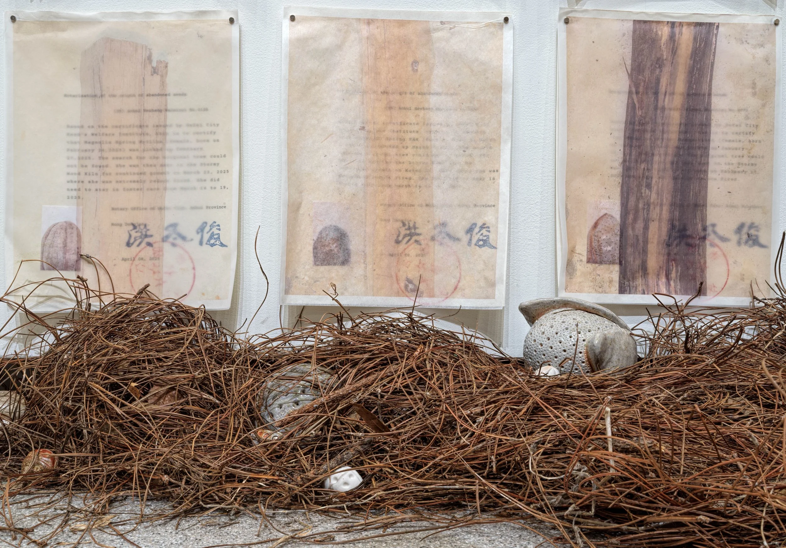 Facing Forward confronts the idea of origin, loss, and confusion through paper documentation and hidden ceramic sculptural seeds. The installation reminds viewers that through laying everything out something new can be discovered. Instead of living in fear that embracing what makes us different is what makes us who we are. That the missing parts of our story leave space for growth into who we are meant to be.